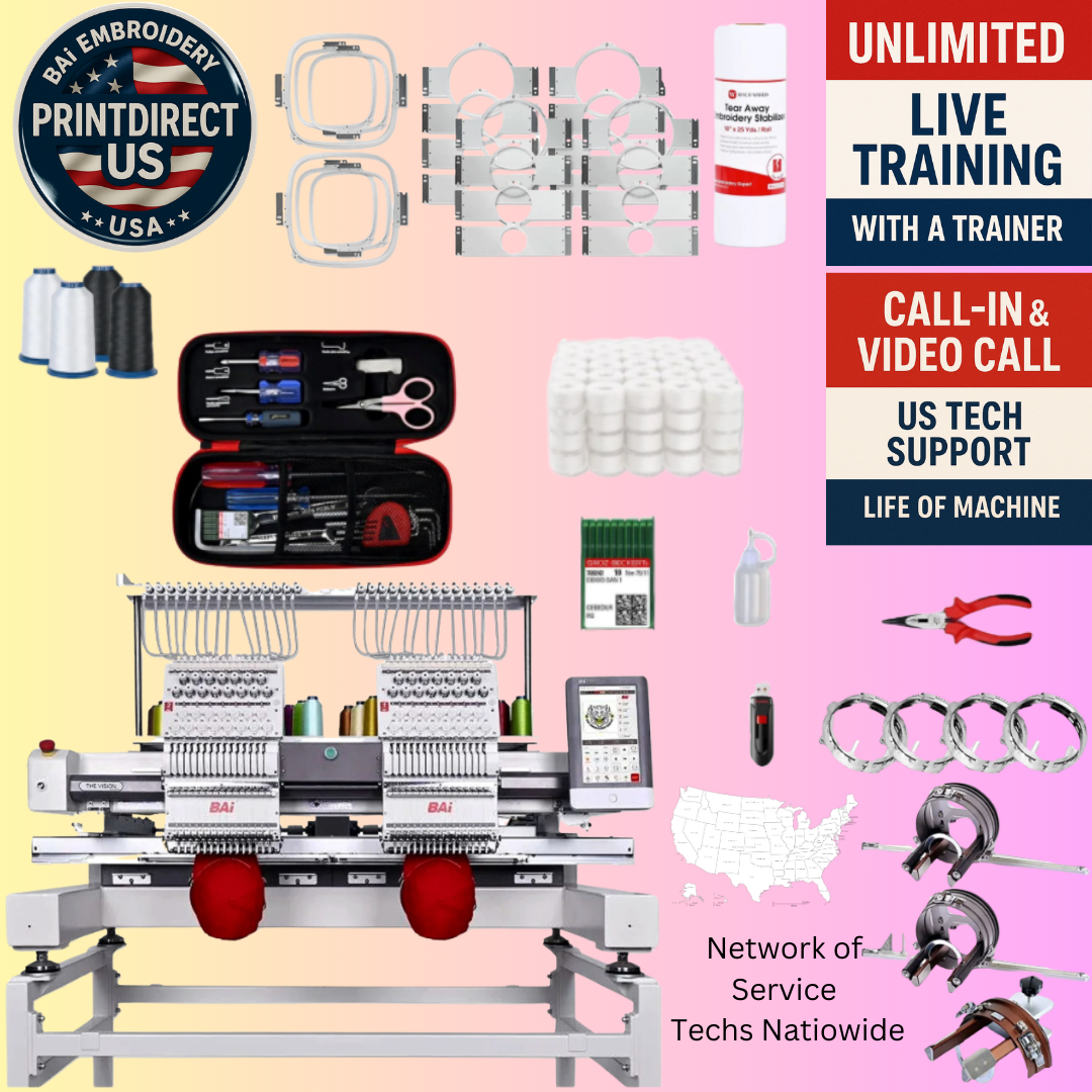 Ready to scale your embroidery business? The BAi Vision 2-Head Embroidery Machine is built for speed and versatility. With two heads and 15 needles each, it handles hats, jackets, patches, and 3D foam embroidery with ease. Its powerful Institch 5.0 Motion Control System and 10" HD touchscreen deliver intuitive, efficient operation — built for serious production and business growth.
